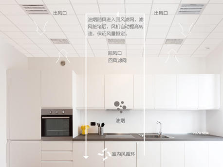 機組可智能檢測風口油煙臟堵程度,并自動匹配風機轉速,保證風量恒定,舒適不衰減。 |